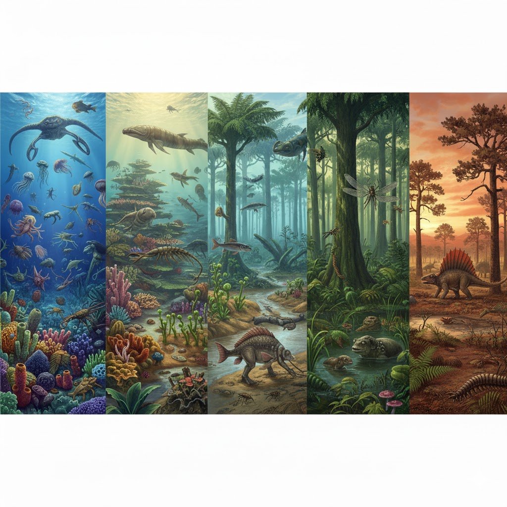 - Sự sống trên cạn: Thực vật bắt đầu xâm chiếm đất liền trong kỷ Silur, mở đường cho sự tiến hóa của động vật trên cạn. Thực vật tiên phong này bao gồm các loại rêu, dương xỉ và cây có mạch nguyên thủy. Sự xuất hiện của thực vật trên cạn đã thay đổi hoàn toàn cảnh quan Trái Đất và tạo điều kiện cho sự phát triển của các hệ sinh thái trên cạn. Động vật lưỡng cư, bò sát và côn trùng xuất hiện và phát triển trong các kỷ sau, thích nghi với môi trường sống mới trên đất liền.