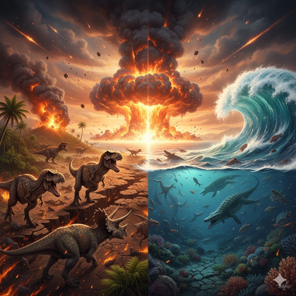 • Sự kiện tuyệt chủng K-Pg: Một sự kiện tuyệt chủng hàng loạt đánh dấu sự kết thúc của Kỷ Phấn Trắng và Đại Trung Sinh. Sự kiện này được cho là do một tiểu hành tinh lớn va chạm với Trái Đất, tạo ra miệng núi lửa Chicxulub ở Mexico. Vụ va chạm gây ra những thay đổi khí hậu thảm khốc, bao gồm sóng thần, động đất, cháy rừng lan rộng và mùa đông hạt nhân kéo dài hàng thập kỷ, dẫn đến sự tuyệt chủng của khoảng 75% các loài sinh vật trên Trái Đất, bao gồm cả khủng long phi điểu.