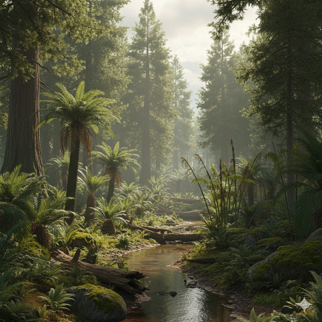 Khí hậu: Nói chung ấm áp hơn ngày nay, với mực nước biển cao hơn đáng kể. Không có băng ở các cực. Sự khác biệt nhiệt độ giữa xích đạo và các cực nhỏ hơn hiện tại. Khí hậu thay đổi từ nhiệt đới đến ôn đới, cho phép sự phát triển của các hệ sinh thái đa dạng.