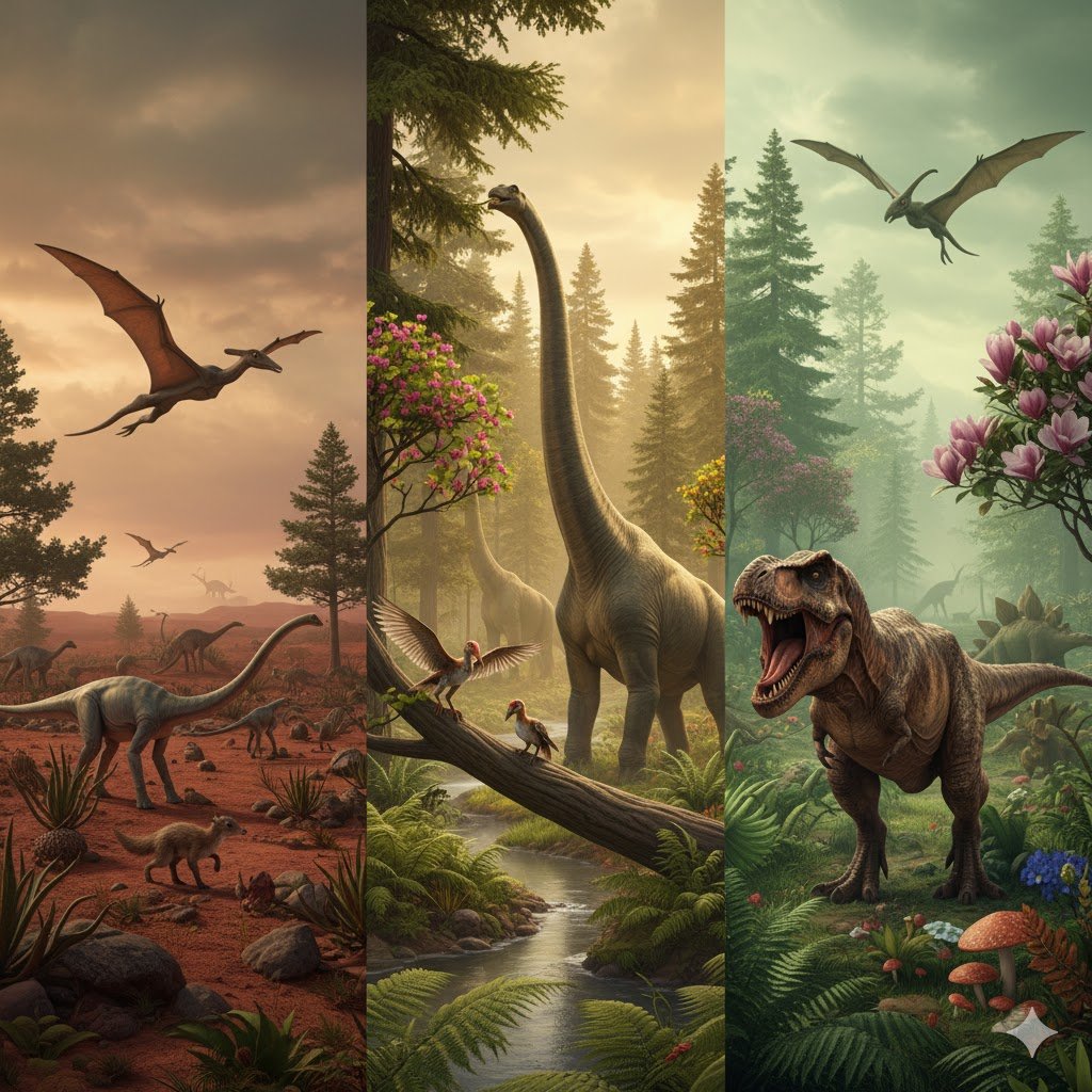 - Kỷ Trias (Triassic Period): (252 – 201 triệu năm trước). Đây là kỷ đầu tiên của Đại Trung Sinh, chứng kiến sự phục hồi của sự sống sau sự kiện tuyệt chủng Permi-Trias. Khủng long bắt đầu xuất hiện vào cuối kỷ Trias.
